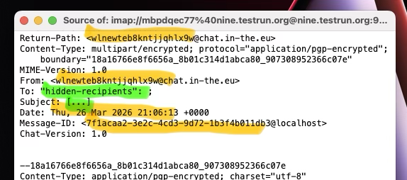 No cleartext Auto-Submitted or threading headers. In addition to Subject, To, and group membership headers, we’re now also protecting Auto-Submitted, References, and In-Reply-To. This means that all meaningful header metadata now lives exclusively in the encrypted part of messages, implementing full Header Protection (RFC 9788). Transport servers only see a minimal so-called outer envelope. See this chatmail core PR for an example how it was done.